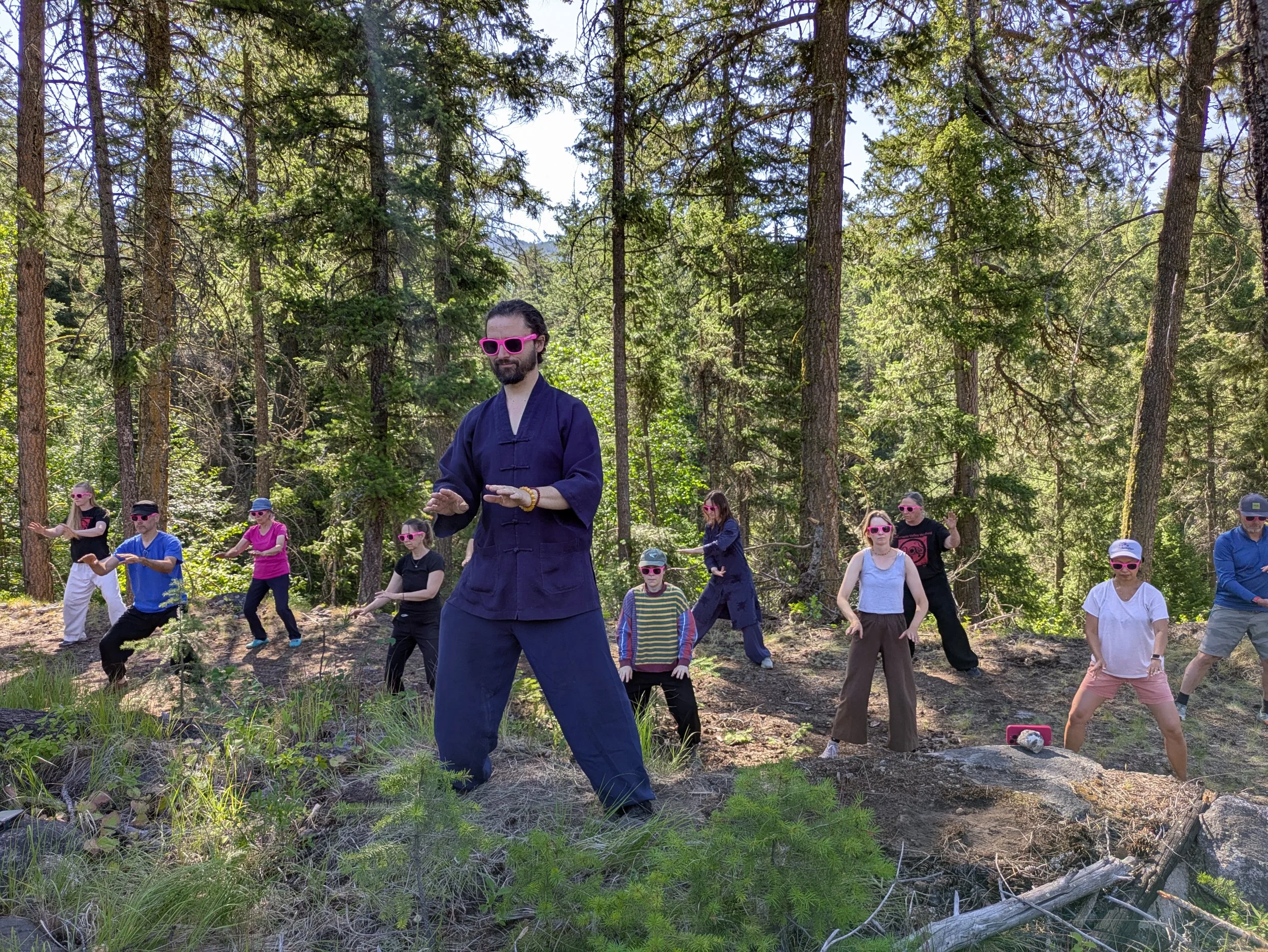 Last year we held our first summer camp on our land out here in Naramata, BC. We kept it small, kept it close—mostly local students, friends, a few new faces. My parents traveled up from New Mexico, bringing their warmth and mom’s incredible cooking, turning every meal into a shared feast. Mornings started early, before the heat settled in, moving through the five animals Qigong as the light changed over the hills. Mid morning training was our most intense, going in detail over the movements of the Tai Chi Sword. Then it was lunchtime, followed by a dip in the creek. Afternoon training was slower—down by the banks of the creek practicing sword partner drills, training, resting, talking, and sitting under the trees. Evenings, we gathered on the hill overlooking Okanagan Lake, sitting in quiet meditation, watching the last light fade from the valley. It was a really magical few days